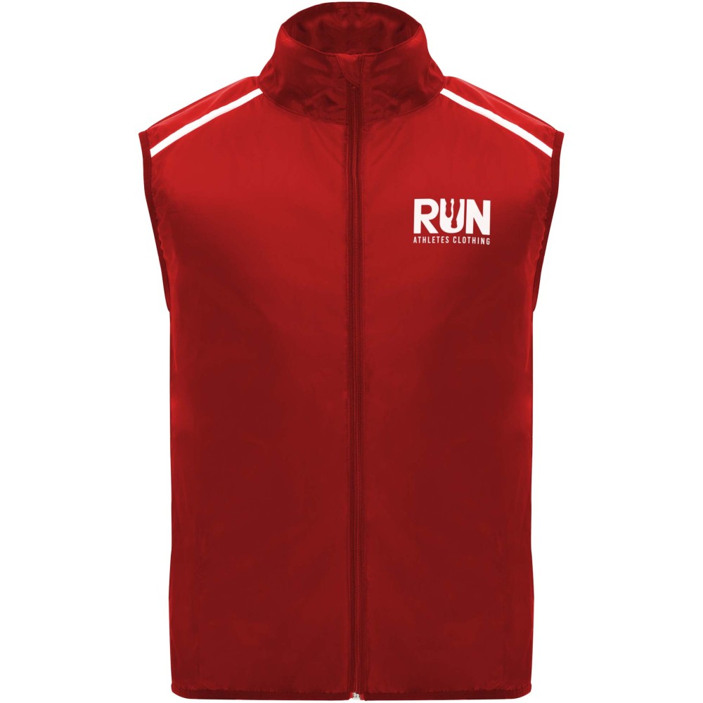 Szélálló és légáteresztő. Elülső cipzár azonos színű állvédővel. Rugalmas szegély a karkivágásnál és az alján. A hát alsó része mikroperforált anyagból készült. Fényvisszaverő csíkok a vállán. Zseb rugalmas pánttal, amelybe a mellényt el lehet csomagolni. Eltávolítható címke.