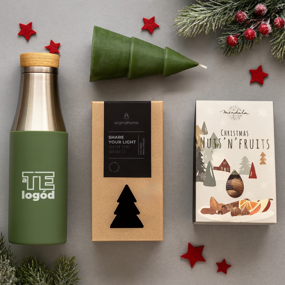 A természet szerelmeseinek szóló összeállítás, amely egy téli sétához vagy kiránduláshoz nyújt tökéletes támogatást. A csomag tartalma: Xmas mag- és szárítottgyümölcs mix, 120g (nan), illatmentes, fenyőfa alakú gyertya az Originalhome-tól, 100%-ban természetes és tanúsított pálmamagviaszból (12632562), réz-vákuumos palack, 540 ml (10066762). Csomagolási lehetőségekről érdeklődj ügyfélmenedzserednél! A kép illusztráció. A kínálatunkban szereplő termékek igény szerint kombinálhatók. A csomagot rendelés esetén állítjuk össze. Várható szállítási határidő: kb. 2 hét. A termékek emblémázását és csomagolását nem tartalmazza a csomag ára. A csomagban szereplő élelmiszer csak csomag részeként rendelhető. Csomagoló anyagok