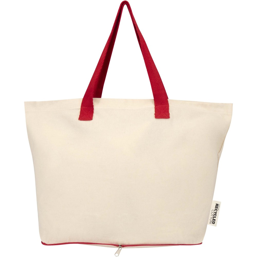 A könnyű és praktikus Sierra összehajtható bevásárlótáska 100% újrahasznosított pamutból készült, GRS tanúsítvánnyal rendelkezik. A 140 g/m2-es anyagsűrűség tökéletes egyensúlyt teremt a rugalmasság és a tartósság között. A táska az alján található cipzáras zsebbe saját magába visszahajtható, így kompakt méretű és könnyen hordozható. Ideális bevásárláshoz, ügyintézéshez vagy utazáshoz. A dupla fülek extra tartást és kényelmet biztosítanak a nehezebb csomagok szállításakor is, teherbírása 10 kg. Űrtartalma: 7 liter.