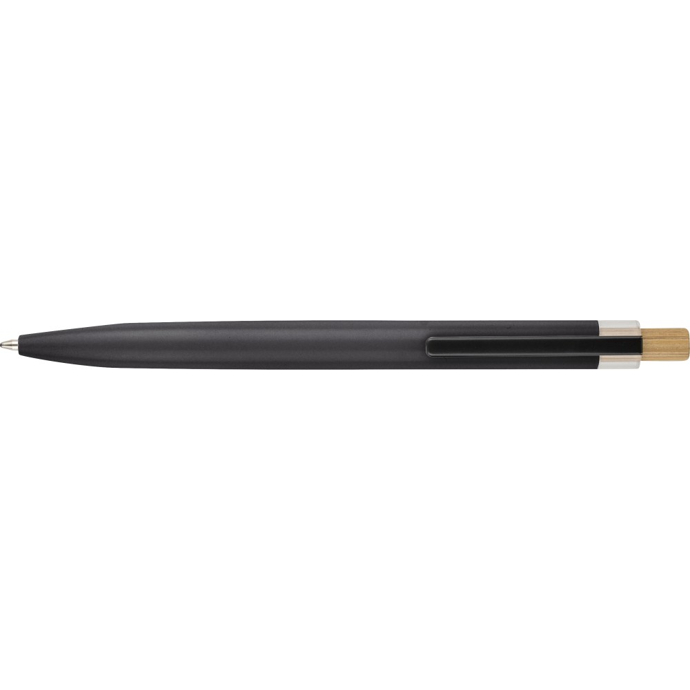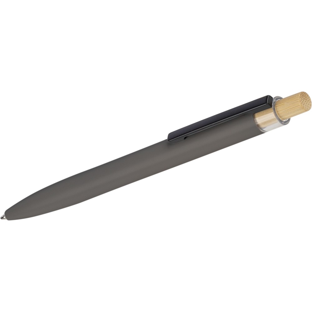 Újrahasznosított alumíniumból készült, lakkozott, nyomógombos golyóstoll bambusz nyomógombbal, rPET díszítéssel és fém klippel. A tolltesten gravírozott recycled (újrahasznosított) alapanyagra utaló logó található. Megközelítőleg 700 méter íráshossz, kék tollbetéttel.