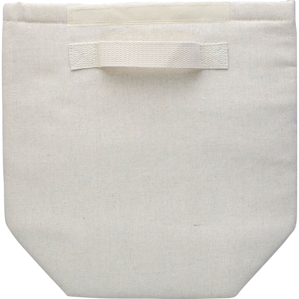 Feltekerhető hűtőtáska, belsejében 3 mm EPE és 12C PEVA béléssel. Tépőzáras záródással, egy kis elülső zsebbel és rövid hordozópánttal a tetején. Az oldalon újrahasznosított pamut anyagra utaló címkével. Újrahasznosított pamut 220 g/m2.