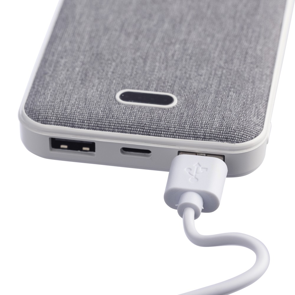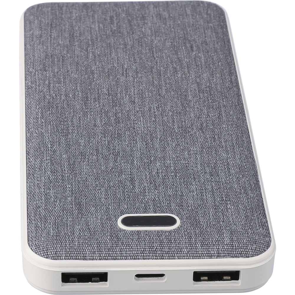 Újrahasznosított ABS és rPET anyagból készült powerbank 10.000 mAh kapacitással, dual USB és USB-C porttal (5V/2.4A), töltéskijelzővel, tetején rPET logóval. 30 cm-es kábel tartozik hozzá. Csomagolása kraftpapír doboz.