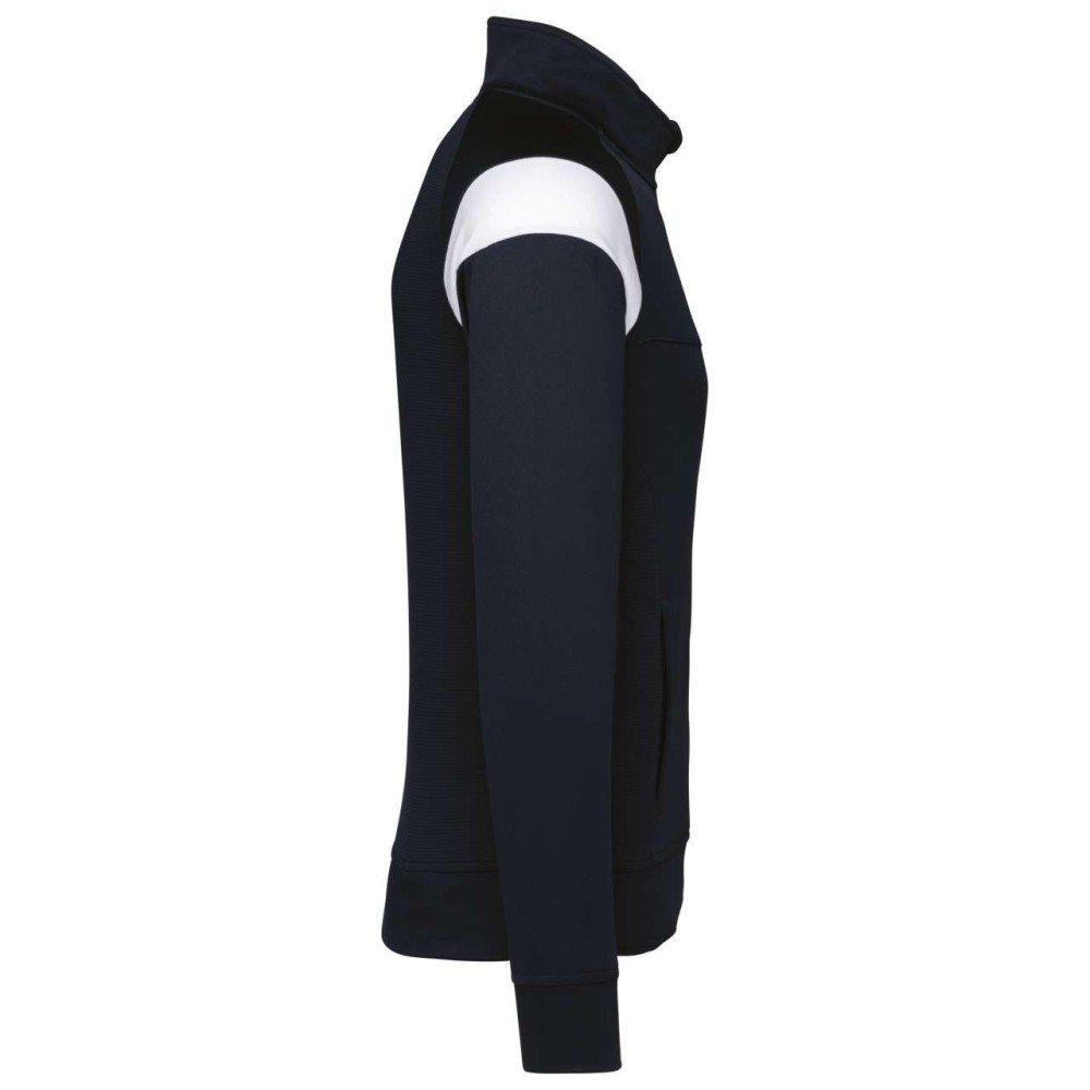 Anyaga: 100% matt poliészter interlock. Egyenes szabás. Elöl fordított cipzáras záródás színazonos nejlonból. Raglán ujjak kontrasztos vállbetétekkel. Kontrasztos mell- és vállkialakítás. Két cipzáras elülső zseb. Texturált anyagbetétek az oldalakon és a hátrészen. Cipzárfedő a felső nyakkivágásnál a nagyobb kényelem érdekében. Könnyen eltávolítható márkajelzés a dekorációhoz.