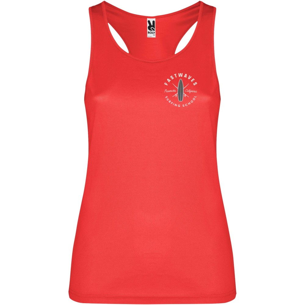 Technikai, légáteresztő, könnyen mosható és gyorsan száradó anyag. Bordázott karkivágások és nyakrész. Racerback kialakítás és oldalvarrások. Eltávolítható címke. 100% Polyester, 140 g/m2.